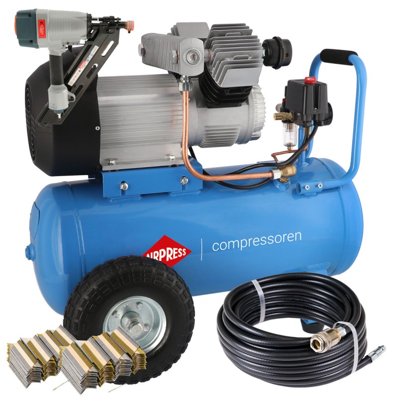 Kompresor dwutłokowy LM 50-350 w zestawie z gwoździarką i akcesoriami to kompletny zestaw do pracy w warsztacie. Zapewnia szybki i niezawodny dostęp do sprężonego powietrza oraz gotowy zestaw narzędzi do natychmiastowego użycia.