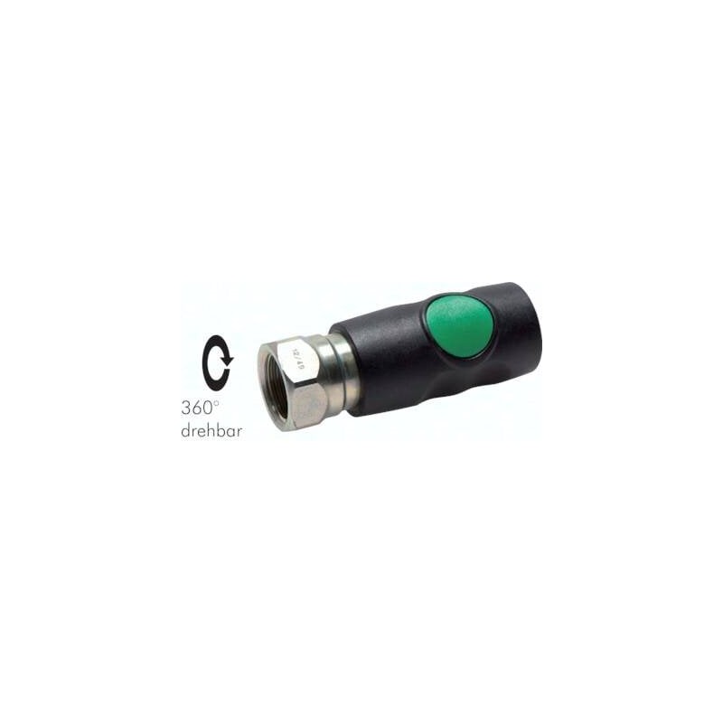 Indeks: KDGISIP12NW7. Bezpieczna szybkozłączka z przyciskiem, nominalna szerokość przepływu NW7,2 (~7,4 mm), gwint wewnętrzny G1/2". Dostępna w wariantach: stal ocynkowana / aluminium / mosiądz niklowany, stal nierdzewna 1.4404 oraz wersja plastikowa (kompozyt przewodzący) z uszczelką NBR (stal: FKM). Zaprojektowana do pracy w warunkach przemysłowych z wymagającym środowiskiem.