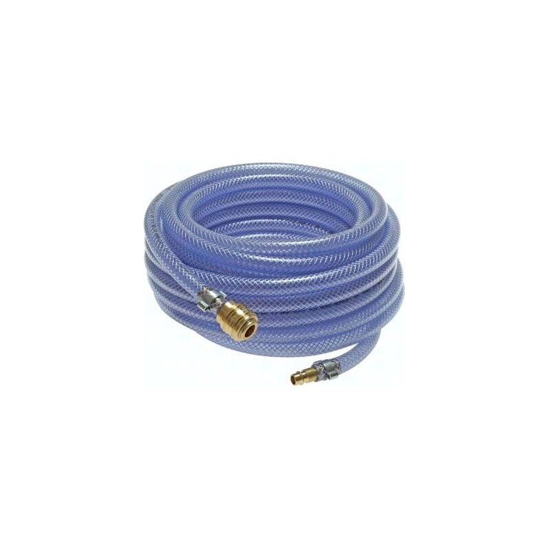 Indeks: TX6‑25KDG. Przewód zbrojony PCW (PVC) z wkładką tekstylną o średnicy wewnętrznej 6 mm i zewnętrznej 12 mm, długości 25 m. Dostarczany z kompletną szybkozłączką i króćcem (gniazdo + wtyk) w standardzie NW7,2; materiał wolny od silikonu; atest jakości.
