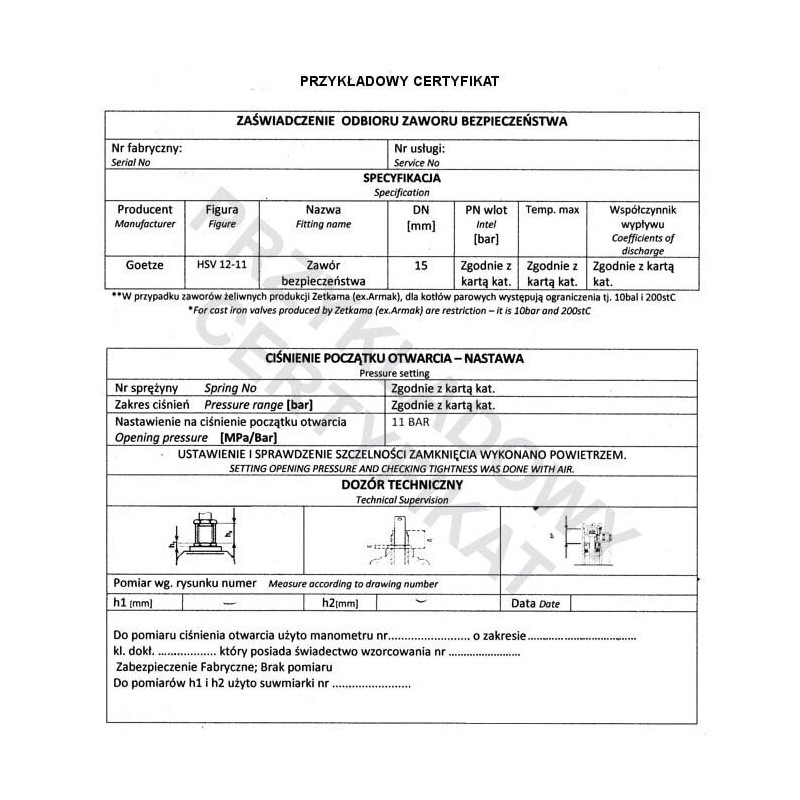 Uwaga: W przypadku zamówienia zaworu bezpieczeństwa wraz z certyfikatem UDT, czas realizacji zamówienia ulega wydłużeniu. Wynika to z konieczności przeprowadzenia dodatkowych procedur certyfikacyjnych i formalnych. Standardowo należy liczyć się z wydłużeniem terminu dostawy o około 3 tygodnie.