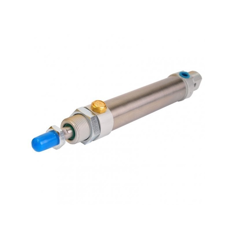 Siłownik zgodny z normą ISO 6432 ma kompaktową, walcową konstrukcję o małej średnicy tłoczyska, co umożliwia montaż w ograniczonej przestrzeni. Model D16x10 to jednostronnie działający siłownik pchający — dostarczenie powietrza do komory powoduje wysunięcie tłoka, powrót następuje sprężyną po odprowadzeniu zasilania.